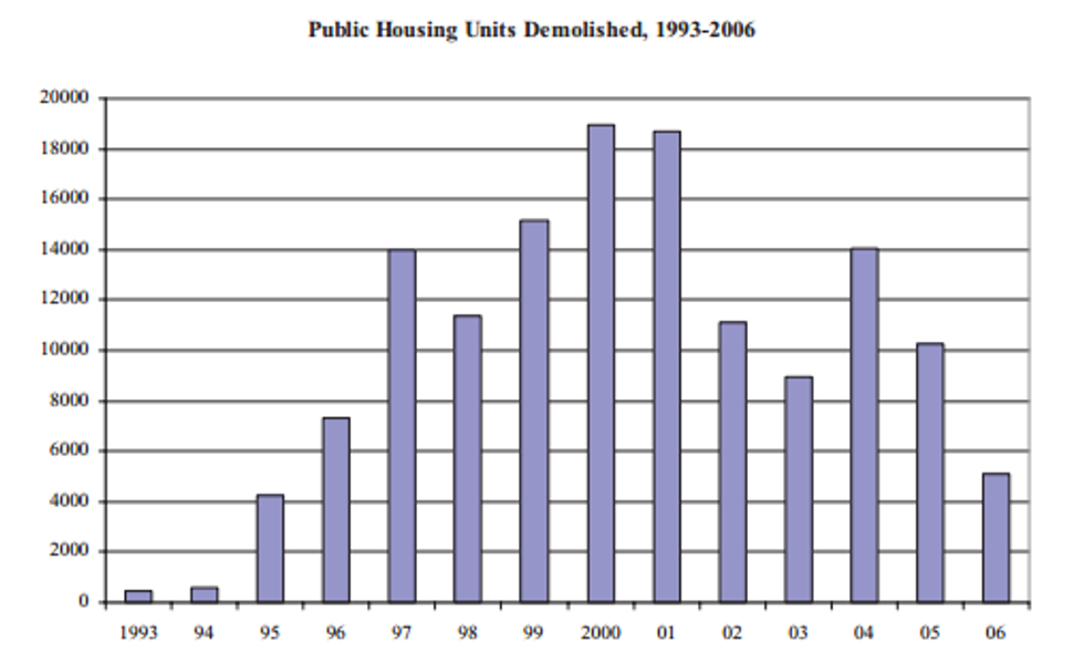 Clinton's HOPE VI program, designed to revitalize public housing, eventually "became oriented toward complete demolition and redevelopment" using private investment. It had the effect of "result[ing] in a net loss of housing units that are permanently affordable for very low-income households."