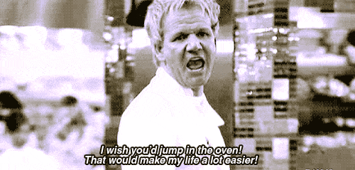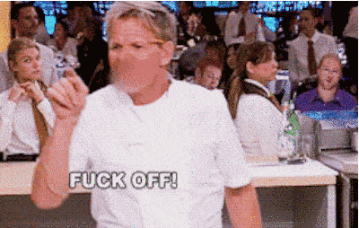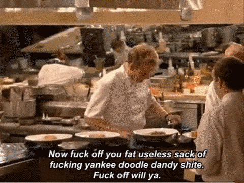 The only thing better than his delicious and world-renowned cooking is his devastating and world-renowned insults. Although Ramsay claims that he doesn’t have a favorite curse word, he uses them all, and quite often - so if you aren't the biggest fan of raging potty mouth, maybe you should sit this one out. After bingeing through Hell's Kitchen and Kitchen Nightmares, here are my ten personal favorites of Gordon Ramsay’s insults:
