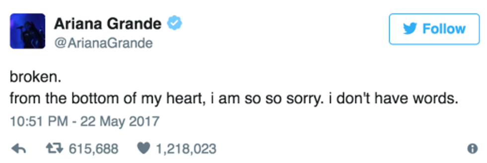 My heart goes out to all of the people affected by this horrible tragedy. There is no reason for any of this to ever happen to anyone. There should be no reason for people to be scared to leave their houses. There should be no reason for people to be on edge at all times. There should be no reason why people are going to have these flashbacks for the rest of their lives now, and possibly never attend a concert again. There should be no reason for any of it. We all need to be there for each other. We may have different backgrounds, different religions, different beliefs but no matter what WE ARE ALL HUMAN. Manchester, my prayers go out to you. I hope one day you will find peace from this horrific event.