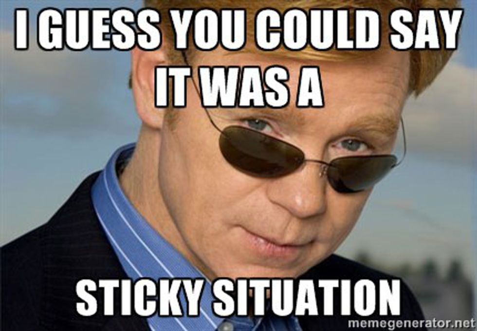 You really want the last copy of the new season of "Gotham." You pick it up and realize it's sticky. To your horror, you realize this isn't the only item. Many items are sticky. How did they get this way? Why is the floor sticky? Could it be that I'm in a sticky situation? At this point you begin to cry as you have stooped to puns to get through your Walmart trip.
