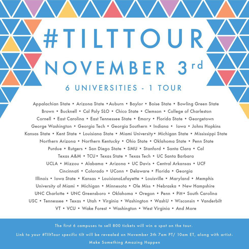 Starting today, the first six campuses to pre-sell 800 tickets will be named one of the Tilt Tour campus stops. Concert stops will be announced as campuses hit the 800 pre-sell ticket mark, by November 20th or earlier. Specific concert dates for the six campuses will be announced December 18th. All concerts will be early next semester between January 18 - February 5, 2016 on a Tuesday, Wednesday or Thursday either on campus or at a nearby venue.