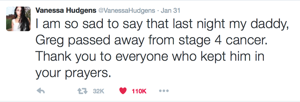 January 31 came around, the day of the premiere. The night that would make history, but not for the reasons that we thought. This Sunday morning came around, and millions of hearts broke. The country was crying for the loss of Vanessa Hudgen's father, Greg Hudgens, who had been battling cancer. The star tweeted that morning: