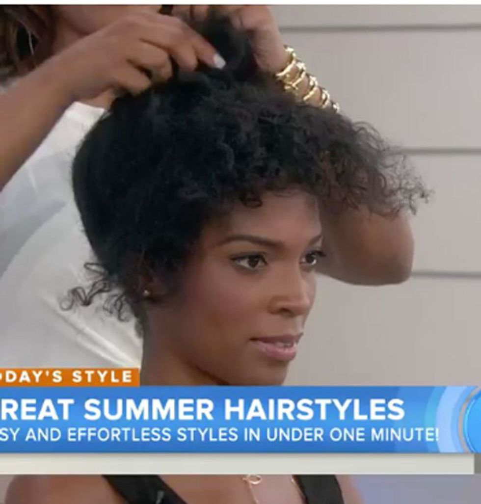Mutyala attempted to prove that she can style any texture of hair in under one minute by giving three different races of women a summer up-do one after the other. Mutyala then proceeded to destroy this poor model's hair on national television. Behold, what may possibly go down as the worst styling in the history of hair-