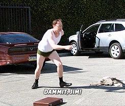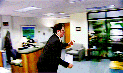 The panic in Dwight's actions as he ran into the building, late, on employee performance day.