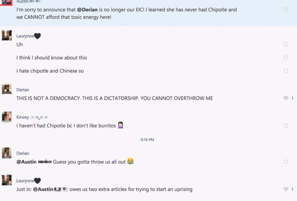 This happened to me. It was July 26th, 2017 at 8:14 pm when I made a joke about a friend of mine never trying Chipotle. Whilst that was disrespectful in itself, I can endure the pain of just one friend. What happened next ultimately changed my life forever: multiple others came forward spilling their crimes against humanity.