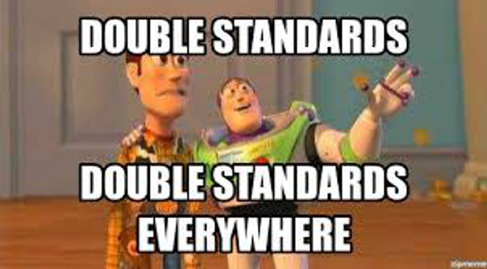 The worst part about double standards is that the scenario I just described is only ONE of many CATEGORIES that can come about when these things are used. Parents tell you to do one thing, even though they do the polar opposite on a regular basis. A guy can get scolded for not holding the door open for a girl, but not thanked when they do. A girl that wants to be treated equally will still chew their date out if they don't pay for her meal. An overweight guy that dates a slim and fit girl is seen as disgusting by other females while an overweight girl getting with a fit guy is seen as "true love" and acceptable. A girl is shunned and called a series of horrible names when she's been with several guys, while a guy in the same position with girls is praised and called a "player." A guy can get playfully punched by a girl, but when they do it back, they're suddenly labelled an abuser. A guy cheats on their girlfriend, then get upset when they hug another guy, and vice versa.