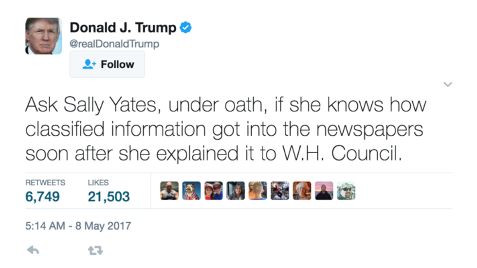 In the news this week was the confirmation of a Virginia Grand Jury investigating Donald Trump’s ties to Russia along with former Deputy Attorney General Sally Yates testifying their cover-up of former National Security advisor Michael Flynn’s ties to Russia. In response, Donald Trump did the two worst possible things a president could have done: he tweeted to Sally Yates that basically symbolized a threat and intimidation to a witness, and he fired FBI director James Comey. The same James Comey who was in the process of investigating Trump’s ties to Russia and confirmed the Virginia Grand Jury’s investigation.