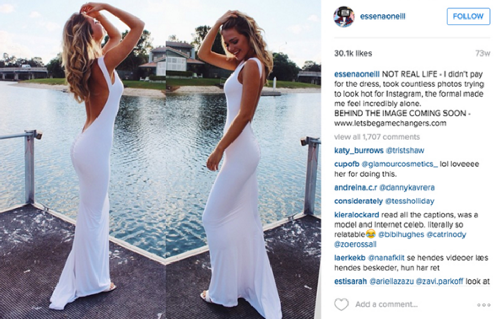 O'Neill revealed to her 600,000+ followers, and eventually a larger population, that the life she created on Instagram was, essentially, not real. She went through her Instagram photos and re-captioned them in order to show what the pictures were really portraying. She re-captioned a photo of herself in a bikini revealing, "Stomach sucked in, strategic pose, pushed up boobs. I just want younger girls to know this isn’t candid life, or cool or inspirational. It’s contrived perfection made to get attention.”