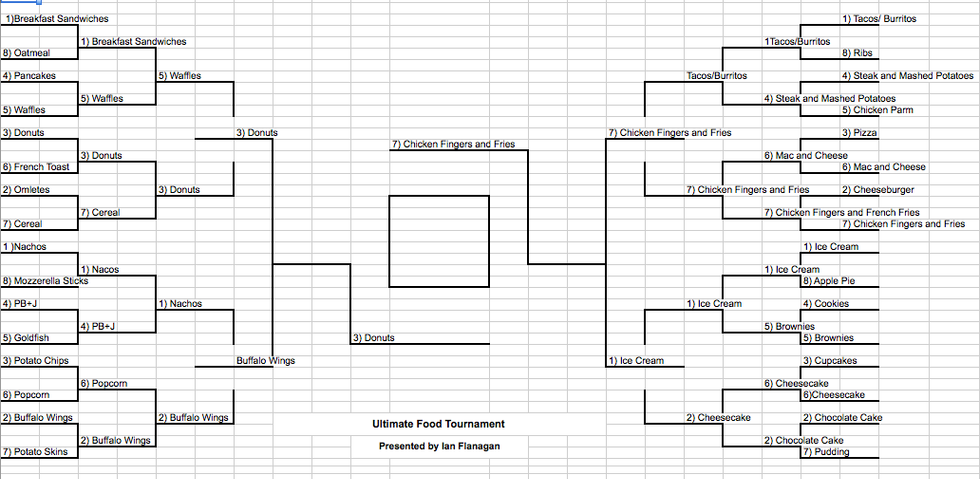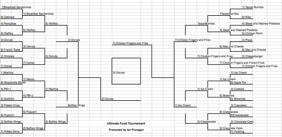 Other than food, one of my favorite things is March Madness basketball. The great thing about March Madness is that anything can happen. I decided to combine the two and bring to you people the Ultimate Food Tournament. In March Madness fashion I will have 32 foods/meals and will break them into 4 "regions" breakfast, snacks/appetizers, entrees, and dessert. I took to my Twitter (@YaBoyFlan) to get a feel for what the people like.
