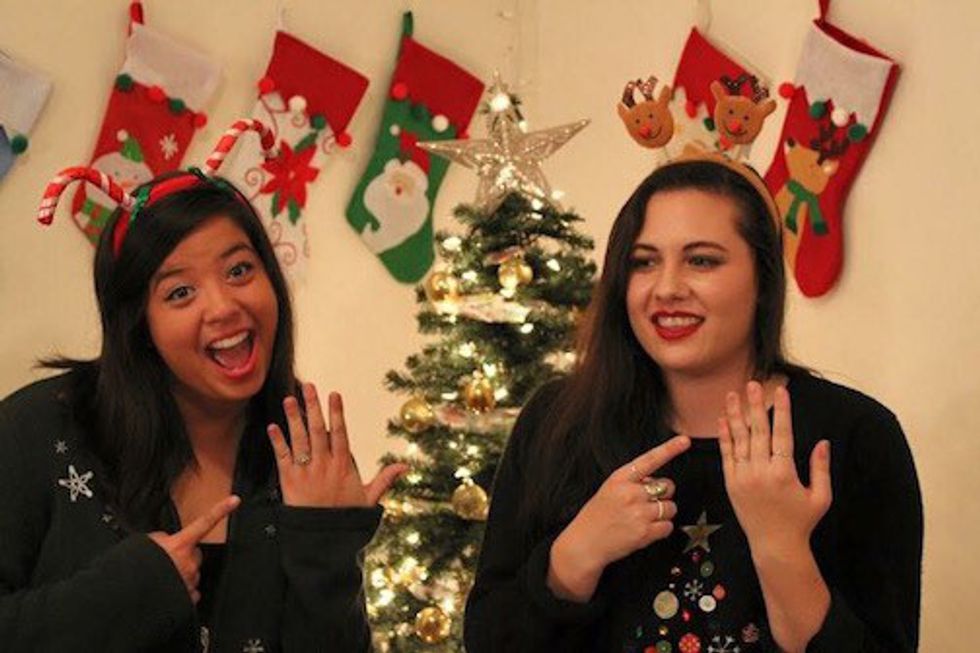 Christmas photo shoot? What a great time to dive in and celebrate that rock. Sometimes, being a third wheel means making your couple friends look good. All in a day's work, I suppose. Make the couple's special announcement the focus, but be sure to carefully incorporate yourself into the excitement. You're their third wheel! People need to know.