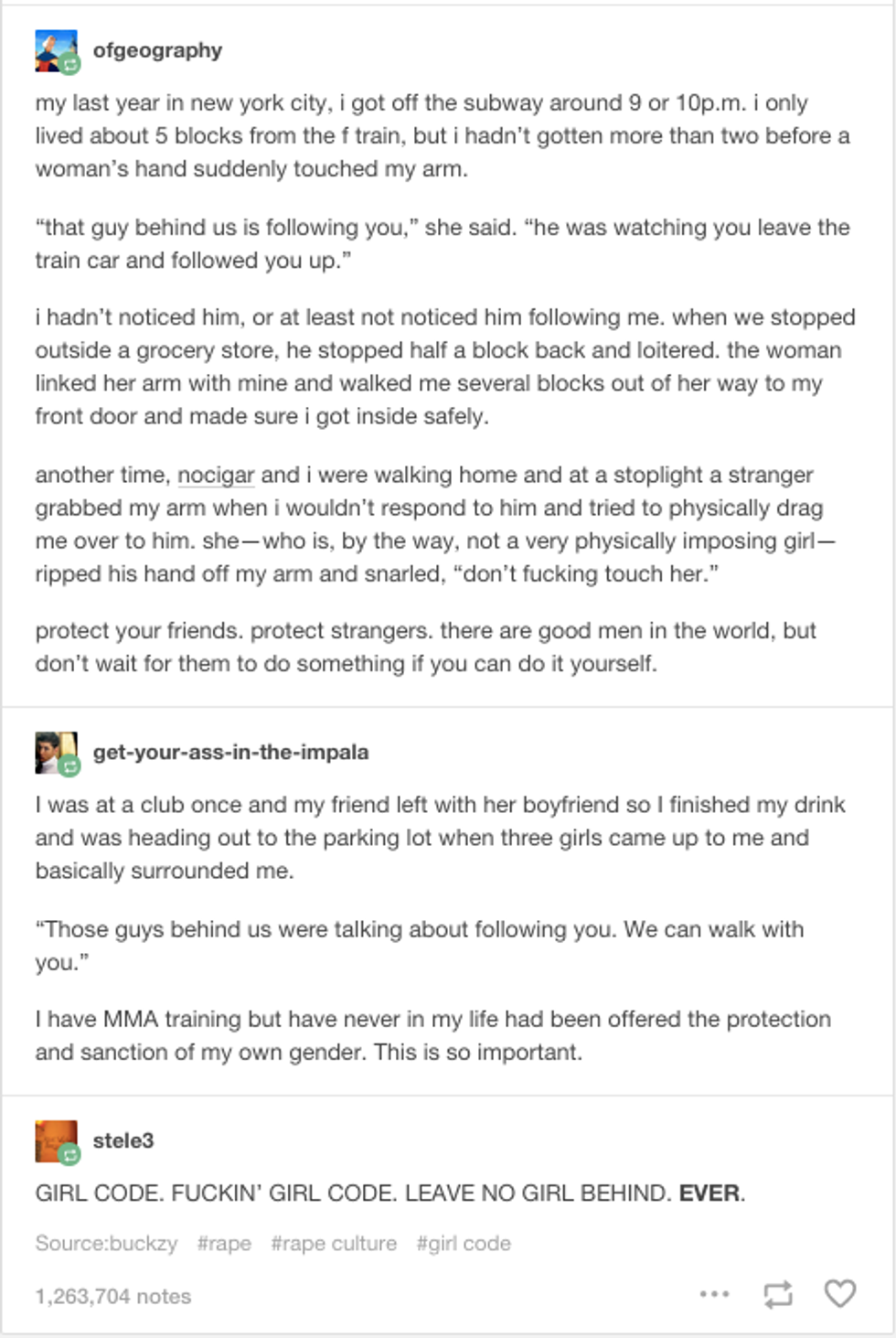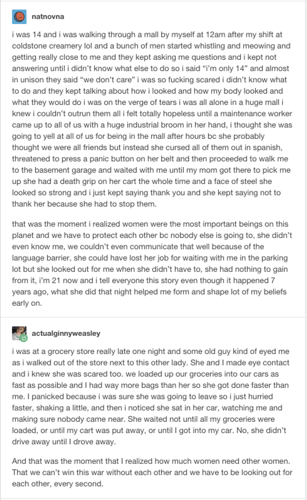 Recently, I came across a viral Tumblr post that made me think about something I’ve never really given much thought to before—women protecting fellow women in everyday incidents of harassment and assault. The post, which first started with a girl sharing her experience about how a female maintenance worker chased off a group of men who were harassing her in a mall, soon became increasingly viral as more and more girls started contributing their stories—each of them starting with unsettling incidents or threats of sexual harassment, and ending with being kept safe by other girls, all of whom were complete strangers.