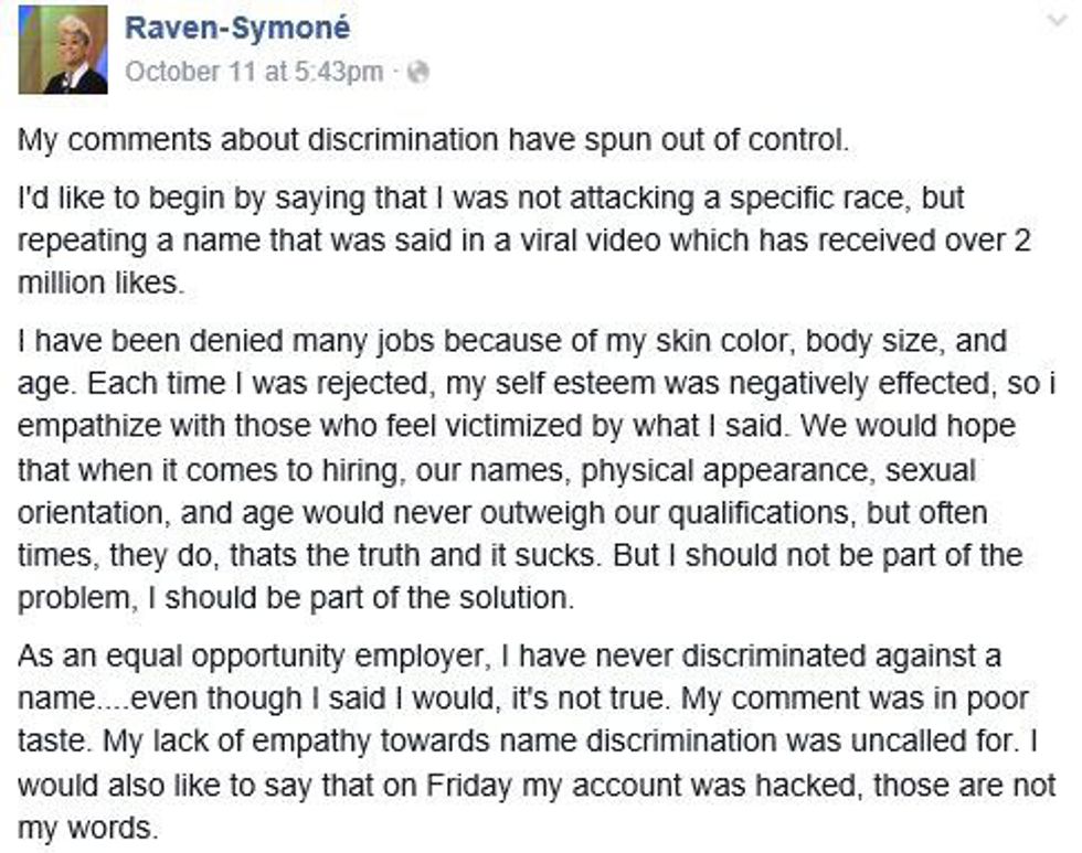 Raven-Symone has since then apologized for her remarks, releasing this statement via Facebook.