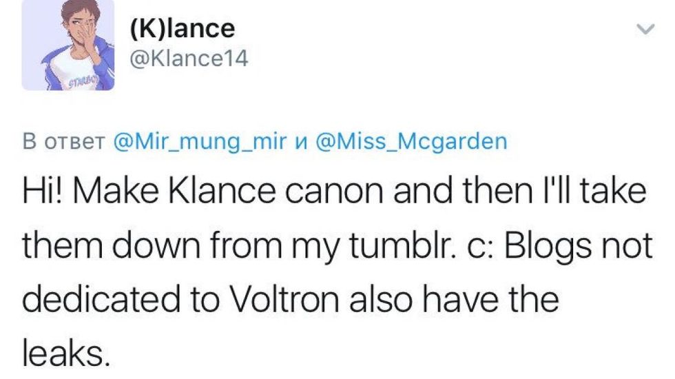 That being said... what the quiznak, Klance14? Are you kidding me?Just because you really want the ship to be canon doesn't give you the right to blackmail Studio Mir into giving you what you want. I'm not sure you're even thinking what you're doing through all the way. I mean, alright. I get it. You want canon Klance. So do me and a lot of other Voltron fans, if I'm being honest with you. Surely, though, you don't realize the magnitude of what you're doing? If you don't, I'm happy to inform you.