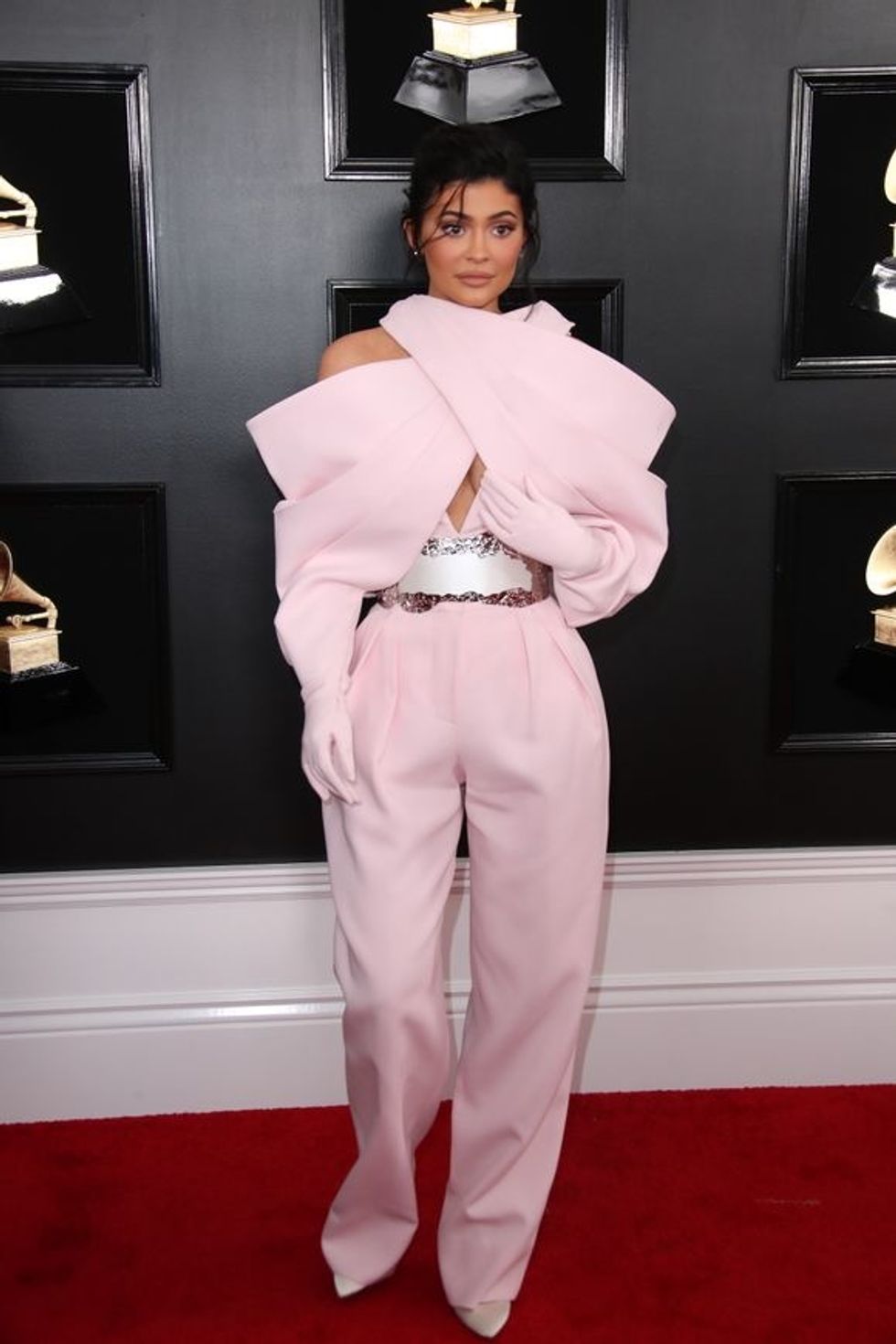 Kylie attended the awards with BF Travis Scott. She wore a quirky Balmain ensemble that seemed to cross in front of her chest and attach to a pair of pink gloves. This outfit makes the worst dressed list because the front of the jumpsuit looks like she's being constrained by the out.