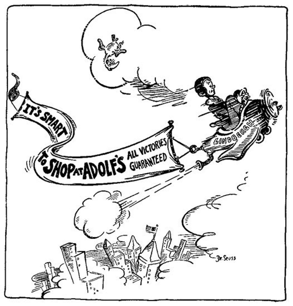Following his anti-isolationism, Seuss was a big critic of the leader of the isolationist movement America First — Charles Lindbergh. If you're thinking of the trans-atlantic flight Lindbergh, you've got the right one. Seuss often portrayed Lindbergh as being in league with the Axis powers, or at least furthering their ideas and agendas.