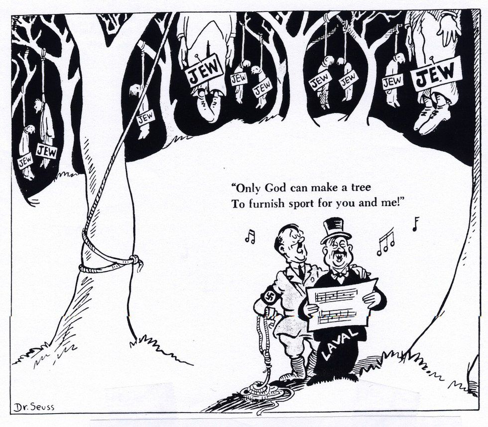 Pierre Laval was the leader of Vichy France -- France under Nazi rule. Dr. Seuss drew this cartoon right around the time the Holocaust reached France.