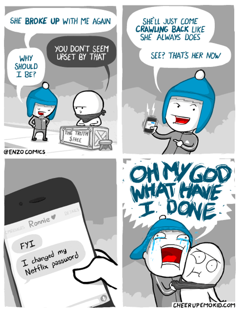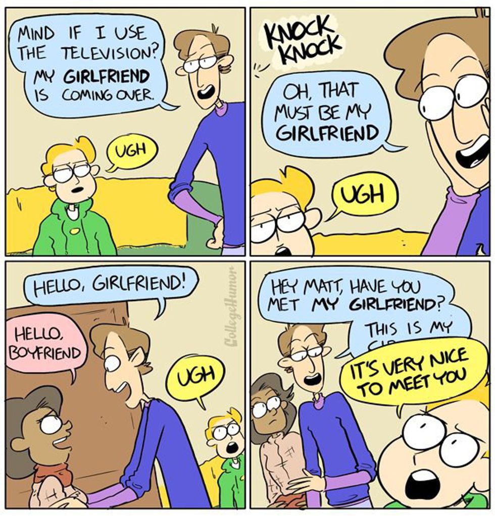 AC Stuart, a cartoonist for CollegeHumor, is hysterical. His best work, besides ones like the strip shown above, in my opinion, come not just from his 'Ben & Steph' relationship comics, but also any comic where Ben deals with the gripes of the workplace. The painful truths behind so many of them will have you laughing and also nodding along like "Damn, dude..."