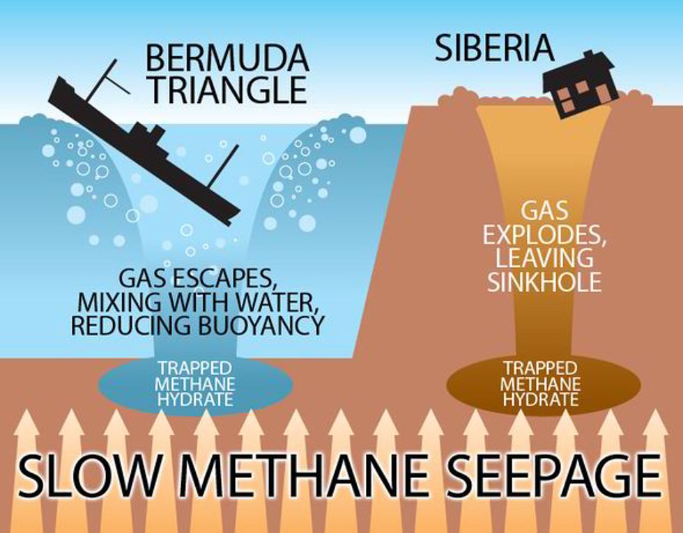 An American geochemist by the name of Dr. Richard McIver asserted that methane hydrates bubble up from sea sediments. Basically, landslides on the ocean floor release vast amounts of this gas on certain occasions, which reduces the density of water. If density drops, so does a ship! This gas could also ignite aircraft engines.