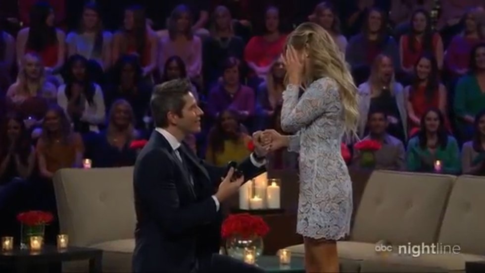 Quick recap: Arie proposed to Becca Kufrin during the season finale, but after a month and a half of their engagement Arie called it off. Only days after, Arie began dating runner-up Lauren Burnham. On the live “After the Final Rose” episode, Arie proposed to Lauren (with Becca in the audience), and she accepted.