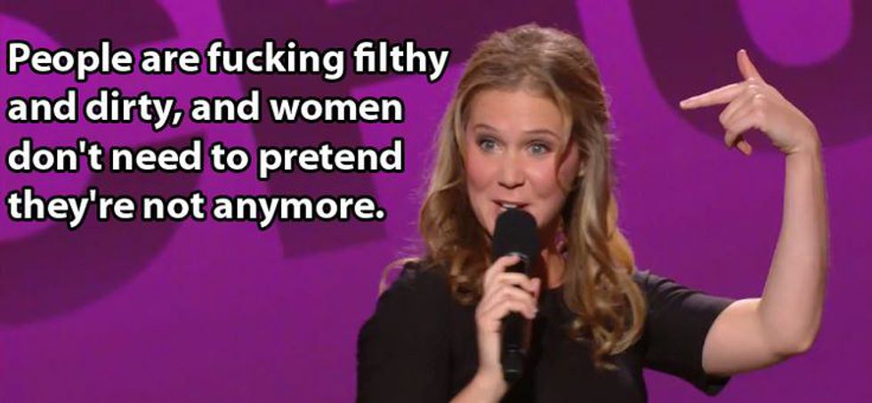 There is something, perhaps, “unladylike” in Schumer's comedy. Her comedy utilizes The Grotesque and The Release Theory, a combination not traditionally embodied by a woman. It is for this reason that people love her, and for this same reason that people have a distaste for her. The Grotesque is the theory that humor is derived from topics involving “anal, oral, and phallic monstrosities whose sexual and catalogical openness hopes to release the world from pathological inhibitions and the stress of maintaining manners,” which results in laughter and “an ambiguous feeling pitched somewhere between pleasure and disgust” (Stott 67). To hear a woman speak this frankly and unashamedly on stigmatized female topics is funny in its incongruity with what you would expect. For women, her stories are so relatable, and to share them is something they could never imagine themselves so publicly admitting. This is where The Release Theory fits in, it’s a moment of breaking and relaxing social norms that relieve the pent up anxiety of acting appropriately. As Amy puts it, “My comedy is unapologetic and fearless. Like, sometimes you’ll wind up having condomless sex with someone that you probably shouldn’t. I’m interested in sharing that part of myself unapologetically so that other people will hopefully feel better”.