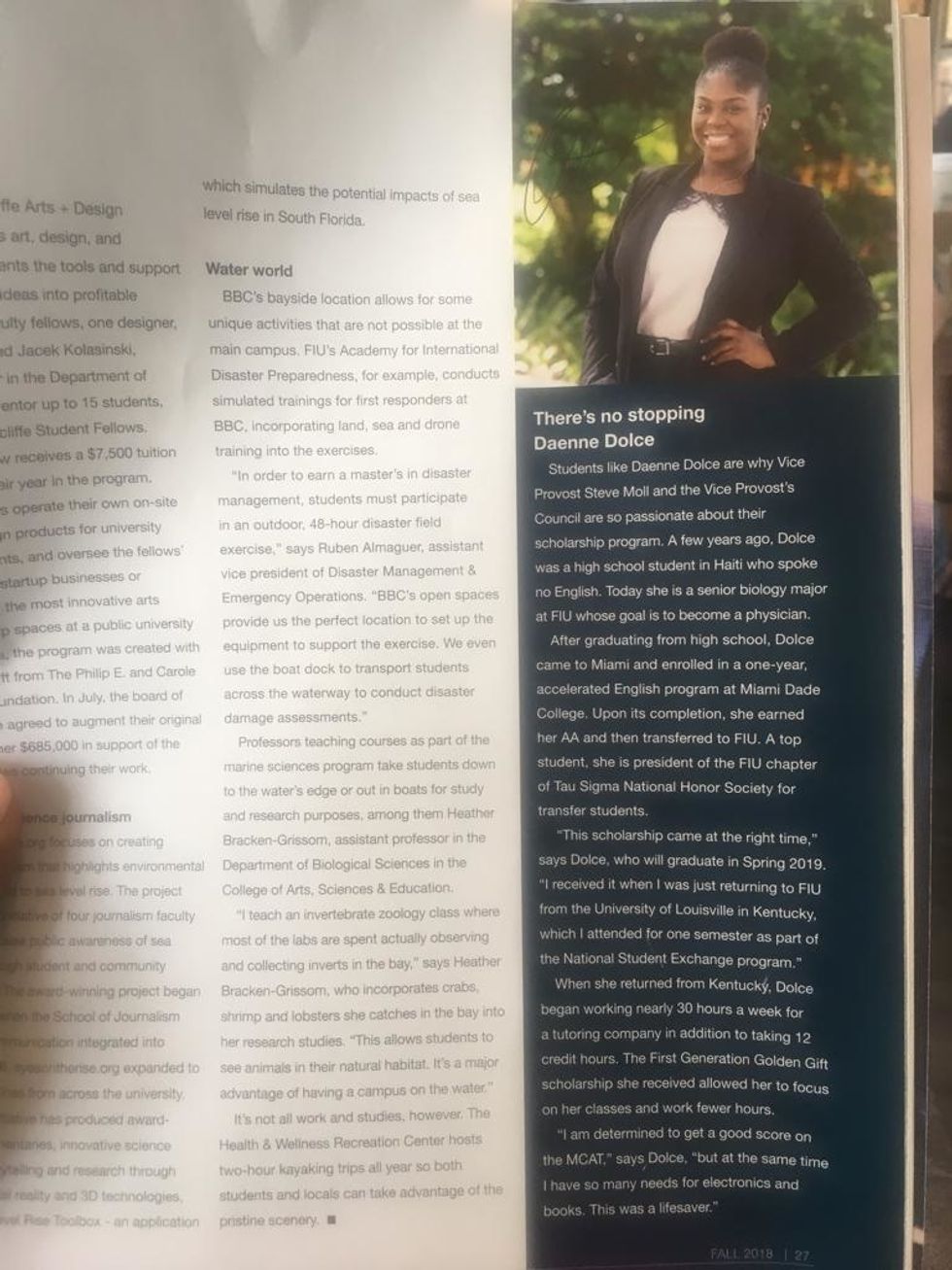 A few months later, I received a call from FIU. They told me how I impacted the people in the room and how the donors were moved by my speech and I was chosen to be interviewed and featured in the next FIU Magazine. I could not believe it; I asked God "who am I for you to do all this for me". They also scheduled a professional photo shoot. After I told them my story, they said we would want to put everything because you've accomplished so much, but we will emphasize on the key ones. I did not mind it at all because just being featured was an honor for me.