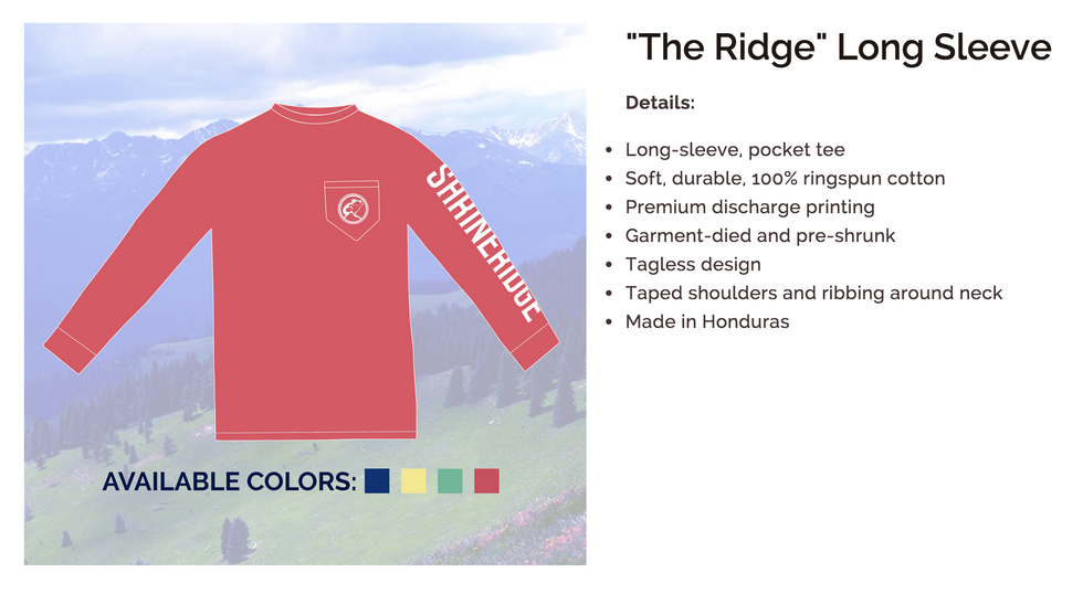 Allen has been designing t-shirts for his fraternity, Beta Theta Pi, almost since the beginning of his college career. Through that process, he discovered that he had a serious passion for designing apparel, and that's where the concept for Shrineridge began in Lexington, but the heart of the company is in the Rocky Mountains of Colorado.