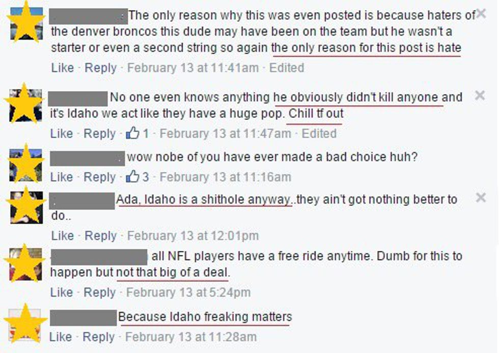 This particular story has a lot of developing to do, and I have no idea what will come of this case, but what I do know is that it sickens me to my core to see the number of people defending the guy. Comments vary from "Maybe he didn't know he was drunk!" to (my personal favorite) "Who cares about Idaho anyway?!" You know, because Idaho is a stereo-typically hum-drum state, so who cares if some rich football player runs over someone's grandma?