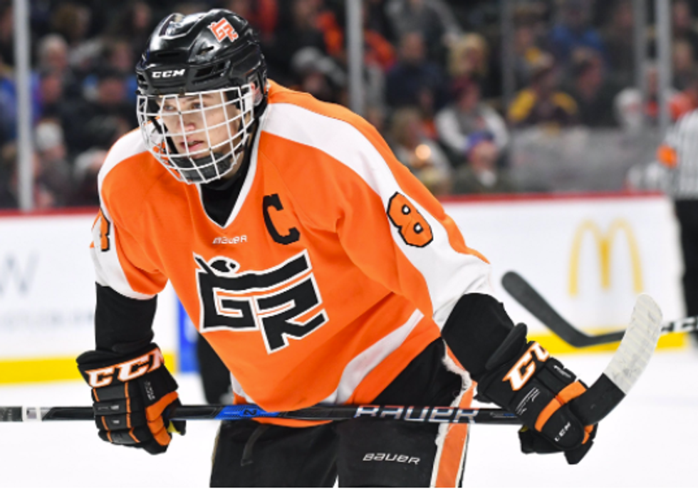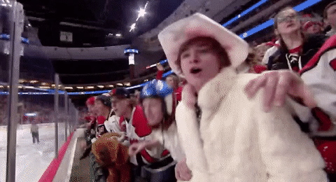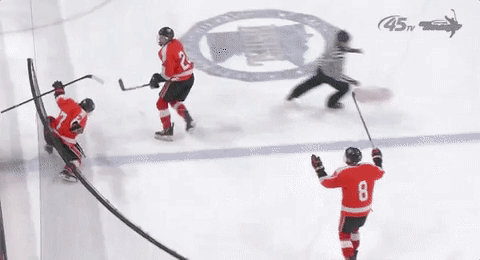 Here you have the goaltender of Grand Rapids celebrating the win. I didn't know that a goalie could jump so high.