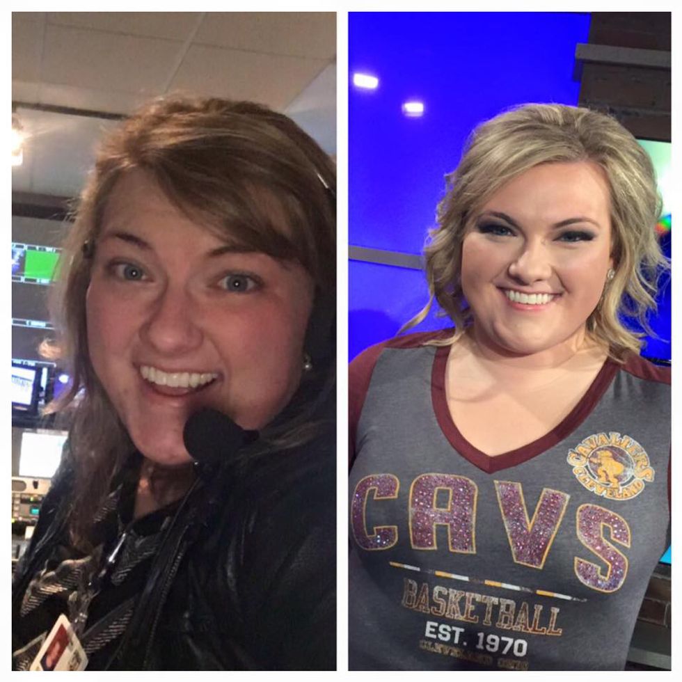 We invited the Cavs Girls to come to the station with their hair and makeup stylists from Dino Palmieri Salon & Spa. Those ladies have flawless hair and makeup, and we wanted to unleash the secrets on how our viewers can get the "Cavs Girl Look." In fact, I was the blank canvas that those stylists used to show off tips and tricks. Here's my before and after, in case you were wondering how big of a transformation this was: