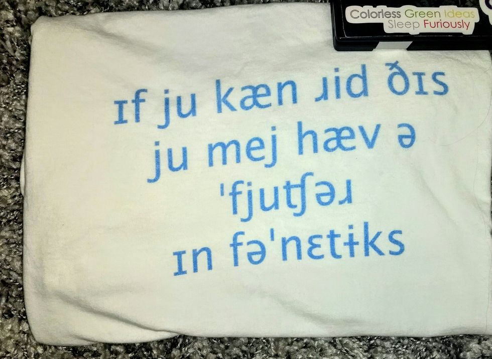Shoutout to my parents for getting me this awesome shirt! If you're like me, you probably have some way of letting everyone in the world know that you are in fact a linguist, and always manages to pique the interest of someone else. I love when people ask about my "Colorless Green Ideas Sleep Furiously" sticker, because then I get to rope them into a discussion of whether or not sentence grammaticality and semantic value are mutually reliant on each other, or when people ask what my shirt says, and then get to explain what IPA is.