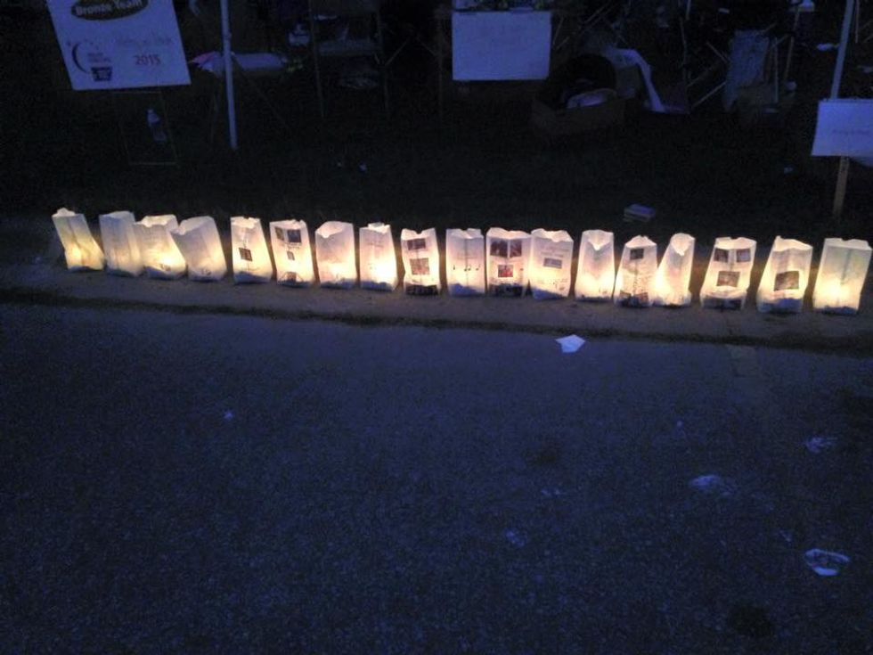 Image caption: Luminaria bags lined the track at Relay for Life. Each bag is in memory of one person who lost their fight against cancer and candles inside the bag are lit before a lap of silence takes place.