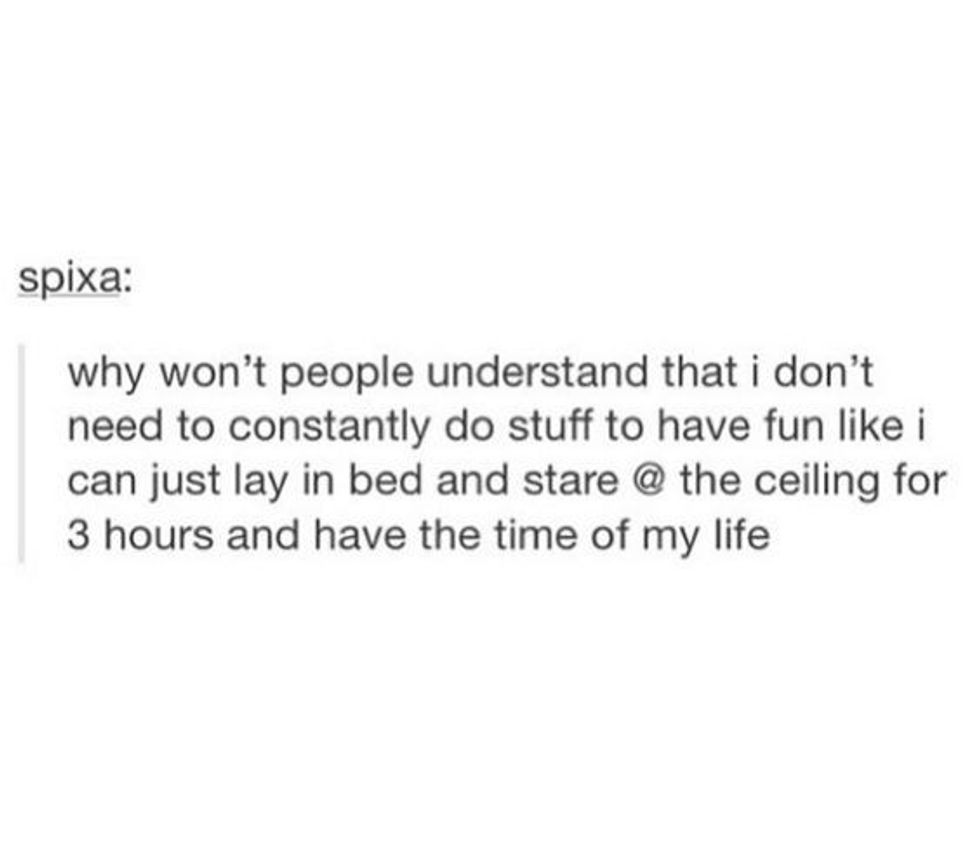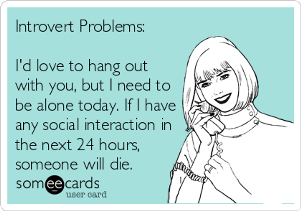 Being introverted has always had a negative connotation to it because people believe that we don't know how to socialize and fear groups of people. However, we know perfectly well how to socialize and most of us enjoy it. But what makes us introverted is the fact that we need downtime to refuel ourselves after large amounts of socializing. We are energized through ourselves rather than other people. If you are introverted, you know this quite well. Here are some pictures that you'll only understand if you're introverted.