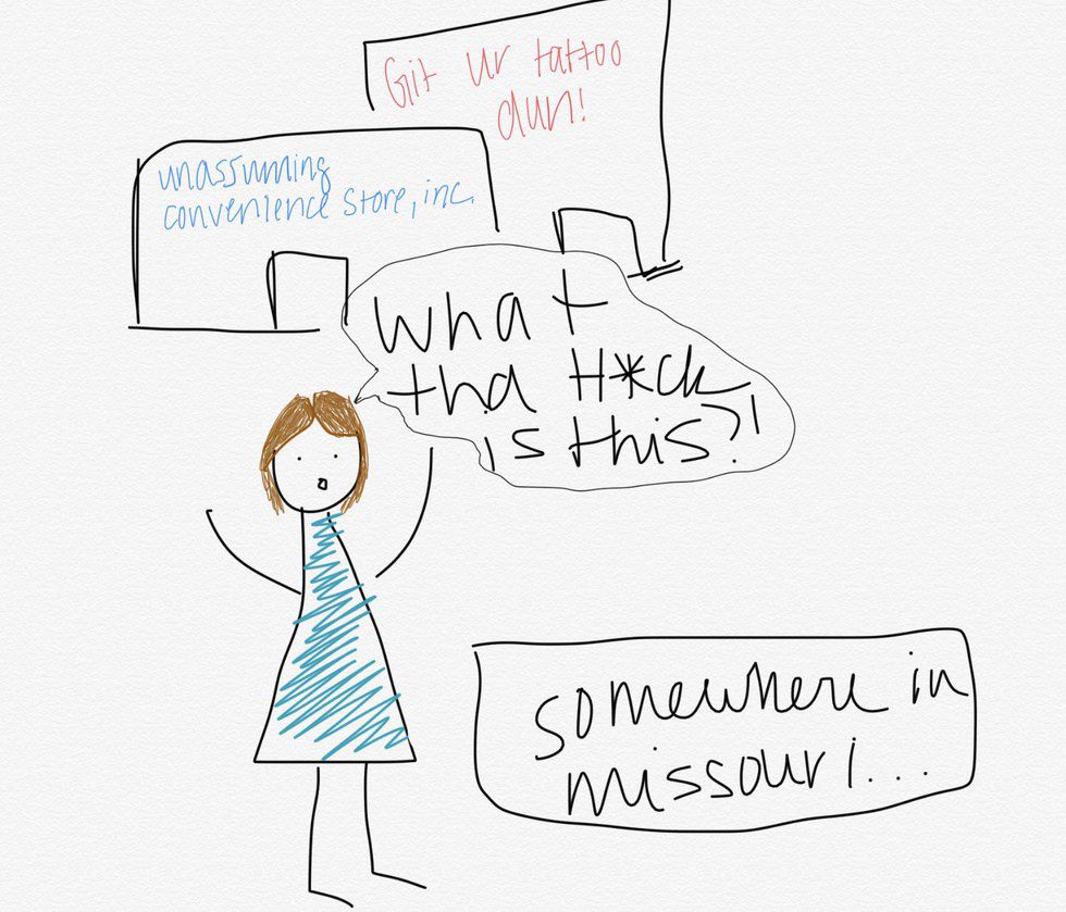 When we were on the road, the buses made stops every hour and a half or so, so people could relieve themselves or stretch their legs. Some of the rest stops we stopped at were unassuming. Some of them were... interesting. For example, on our way to St. Louis, we stopped at this truck stop that also had a tattoo parlor in it, which I found interesting.