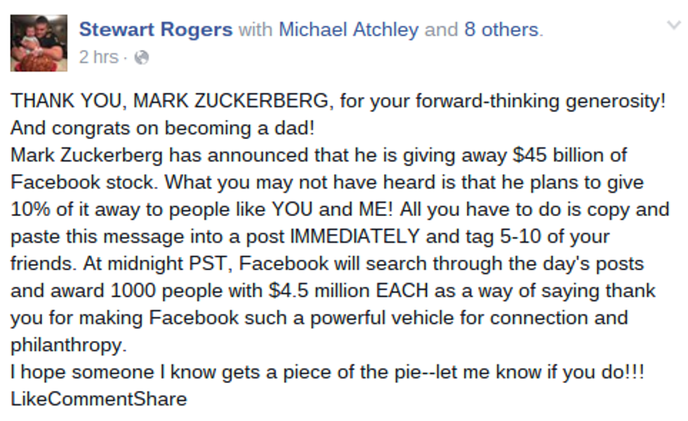 Don't get me wrong, I am all about charity, but really!?! Zuckerberg is giving money away to people who copy a post there is no way of tracking who shared it? This is about as ridiculous as those chain messages you use to get via text back in the day. I never copy these message when I get them, then again, that might be why I am single and Zuckerberg hasn't given me any money.
