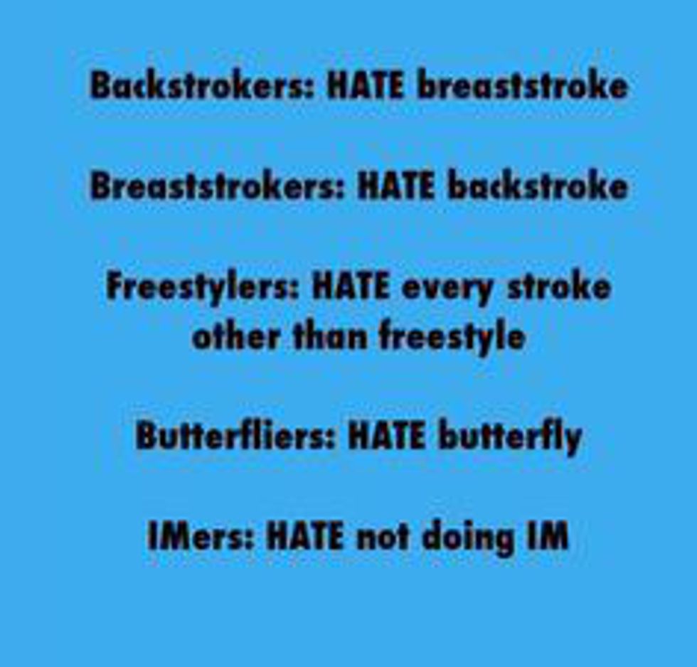 Within a team, there are smaller cliques. They are grouped by stroke. No matter how hard their stroke might be (I'm thinking of you, butterflyers) they can still all bond over the relief that they aren't forced to do one of the other strokes. Personally as a backstroker, hearing my coach telling me to swim breaststroke is a fate worse than death. In my eyes no one should be condemned to such punishment. Of course, the breaststrokers would say the same thing about backstroke.