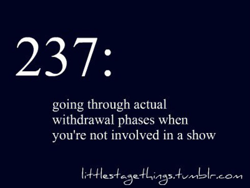 Of course, each rehearsal and play is a sort of high you can't replace. You love it, the lines, the lights, the absolute terror of getting onstage or watching a set change. Even if you deny it and tell people you'll never audition again, there's nothing like being in a show, and it's one of the best feelings ever.