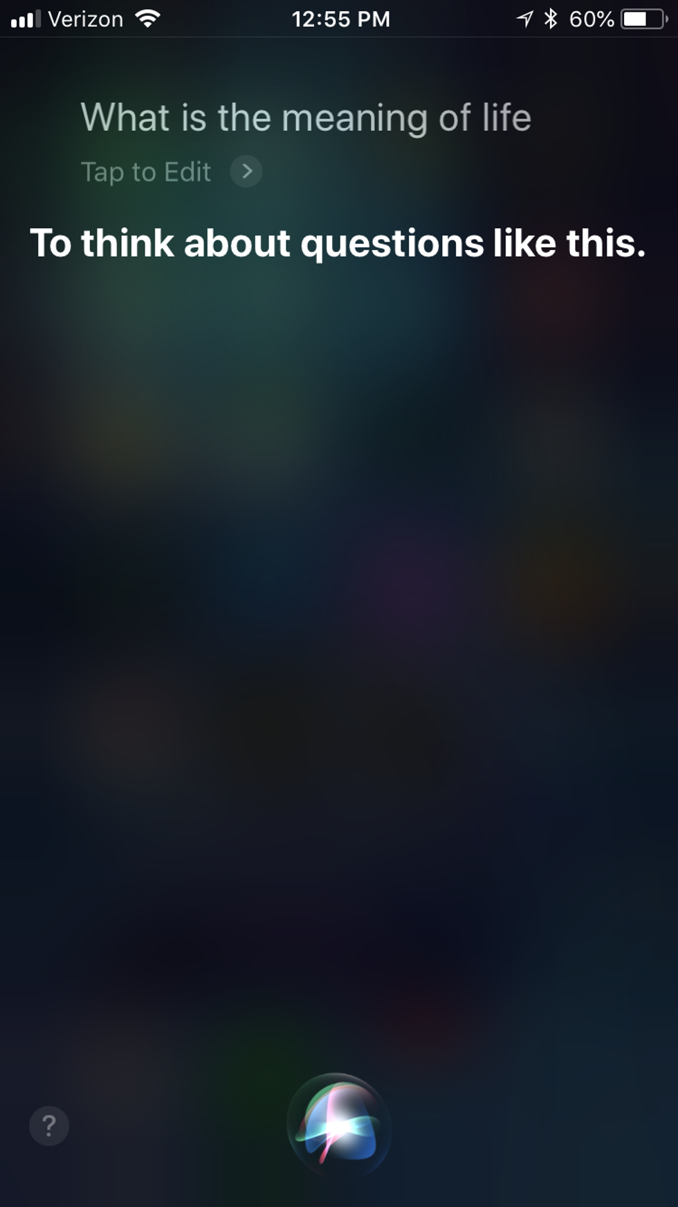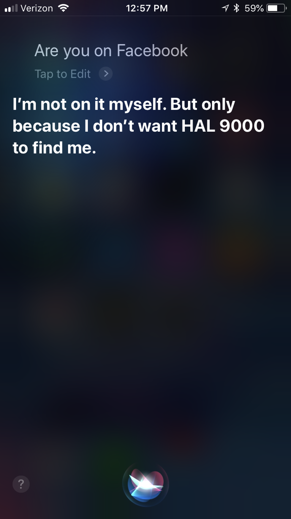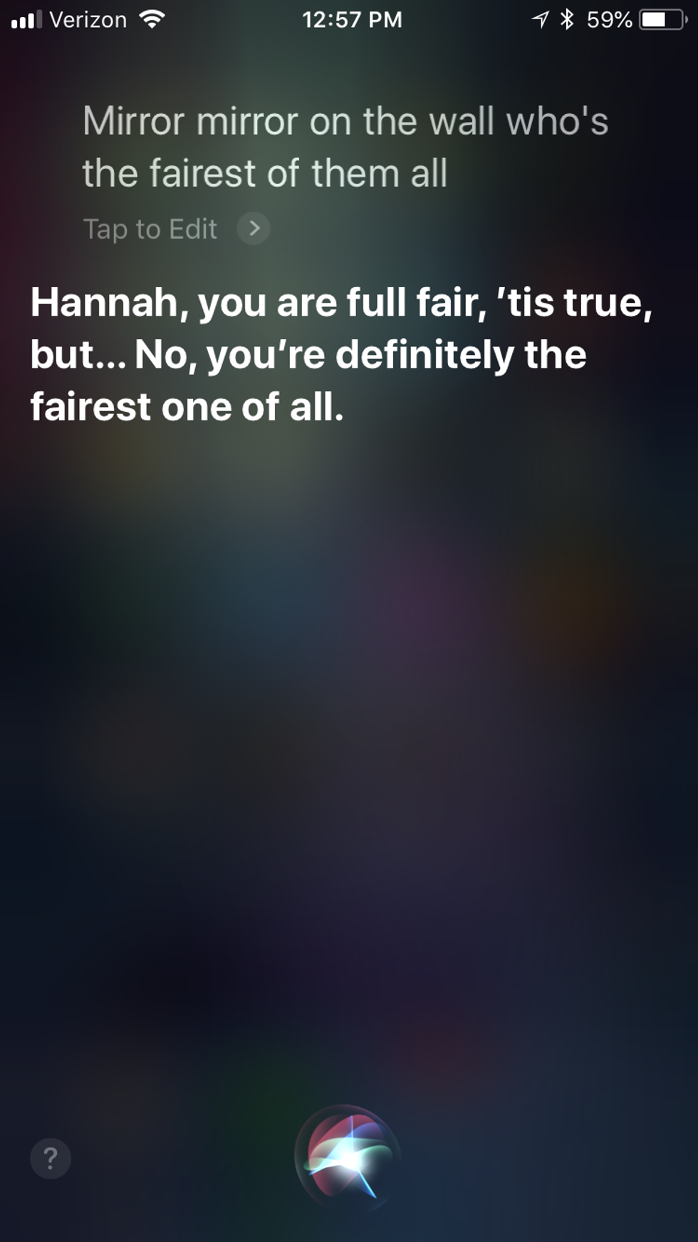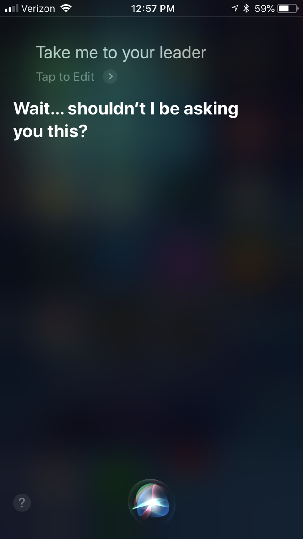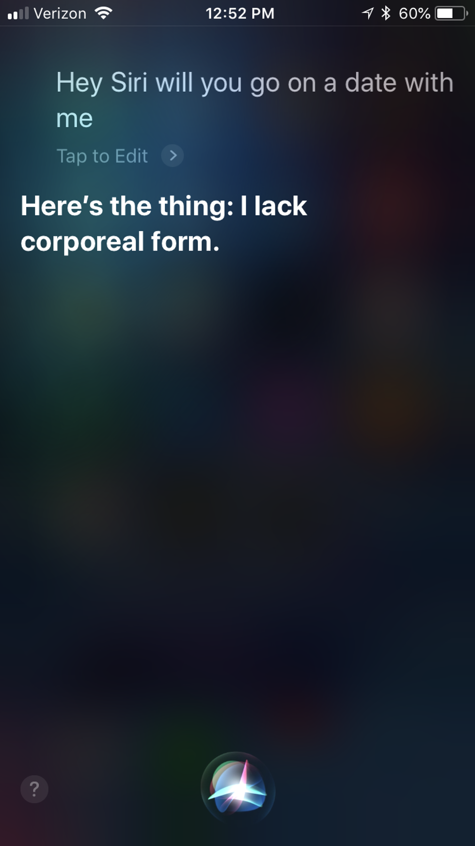 Siri is probably my most favorite thing about owning an iPhone. I'm sure these questions can be used on the Android version. I was pleasantly surprised at some of the responses I got today. I made it to where my Siri is a British man and it's awesome. Here are some of the responses I got when I interrogated Siri.
