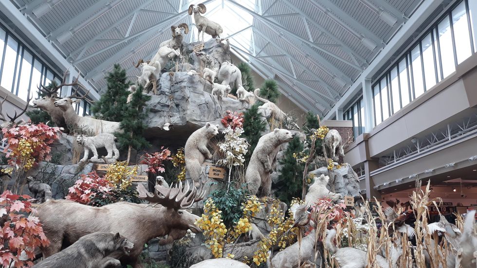 Need a place to get your souvenir, black Friday, or Christmas shopping done? Look no further than Scheels in Overland Park. The pillars at the entrance are literally a mini aquarium, with fish swimming around and an occasional employee scuba diving in there to clean the glass. It is honestly hilarious. Plus, they have random animal statue exhibits like the one pictured above, and a Ferris wheel in the center of the store! It's like a park in there.