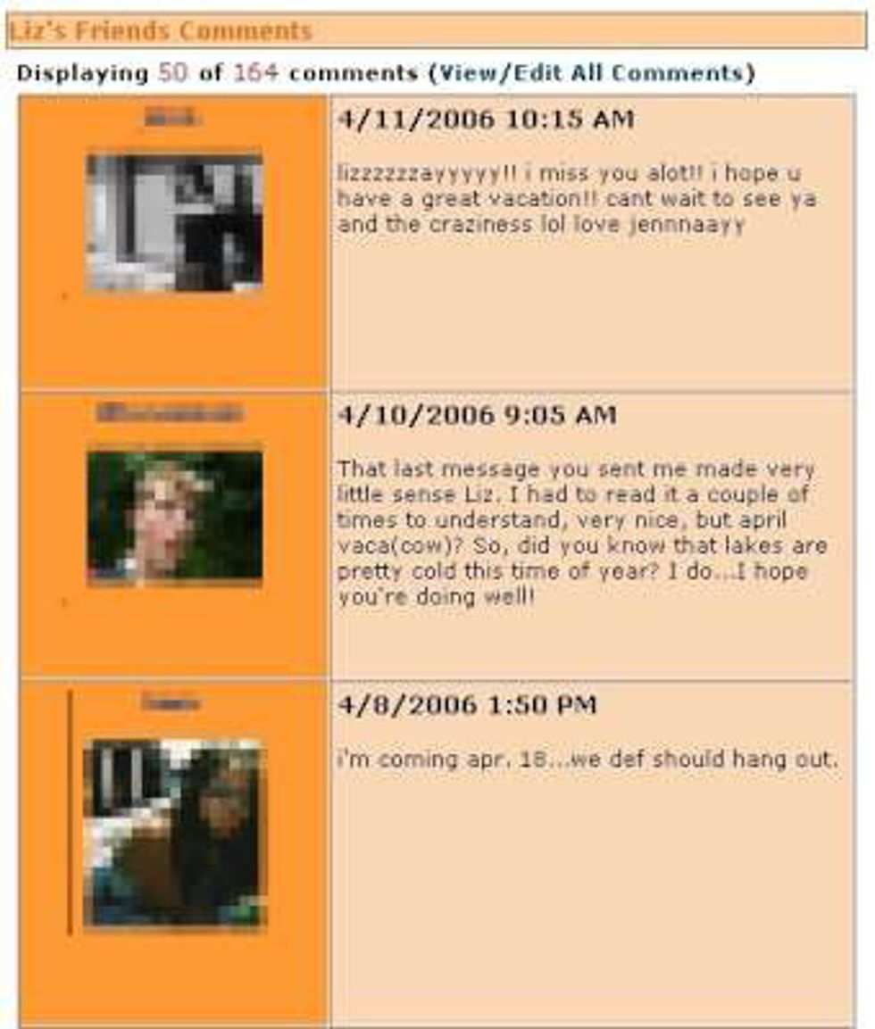Remember the phrase "C4C" – comment for comment? Comments on Myspace were more than just comments. The comments section is where Myspacers held open conversations on their profiles for all of their friends to view. It was normal to find animated and clipart graphics in friend's comments sending happy birthday or get well soon wishes or just a message to say how much they are loved.