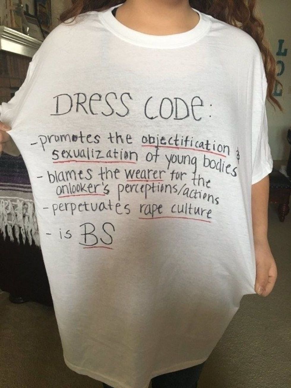 Dress codes serve a purpose. However, no matter the purpose it is accidentally ridiculous that women are targeted more by dress codes than men are. In my high school, we wore uniforms but we had days when we were out of uniform. Men consistently could get away with wearing significantly worse outfits than women could. If shorts were acceptable, the length of a man's shorts was absolutely not considered. Girls are expected to keep their shoulders covered, are not allowed to wear leggings or yoga pants, have to adhere to a length rule for skirts, dresses, and shorts that men do not have to. The reasoning behind all of these rules are that girls are considered distracrting by boys and because we live in an extremly patriarchical society, women are valued less in educational environments.