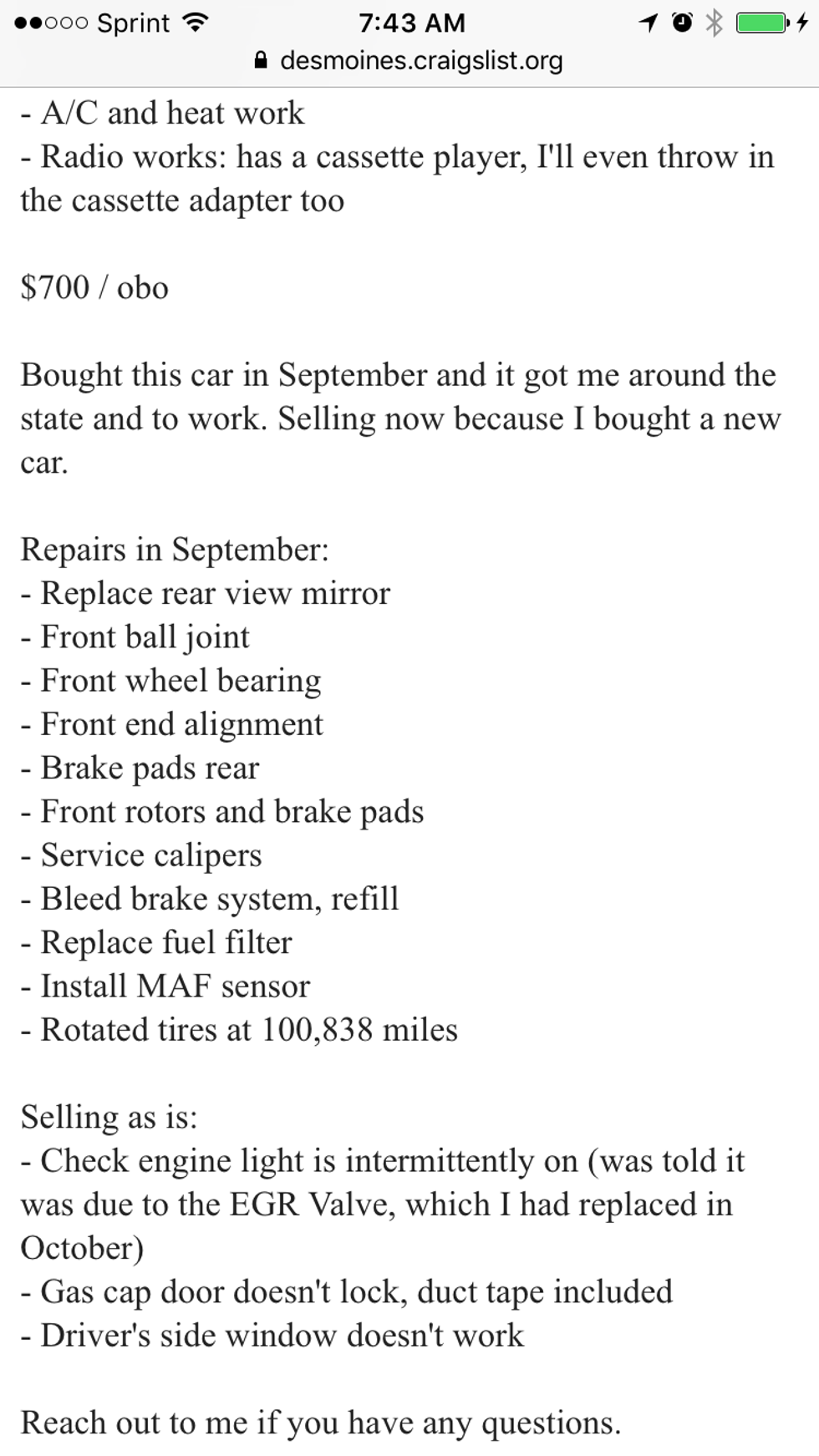 When a good friend insists you take your car into the shop to check it out because it sounds awful, and the repairs are 3x what you initially paid for it, it's time for a new car. So you type up a detailed ad and sell the car for a couple hundred dollars on Craigslist. And throwing in some duct tape with the sale of a car on craigslist is a selling point, right?