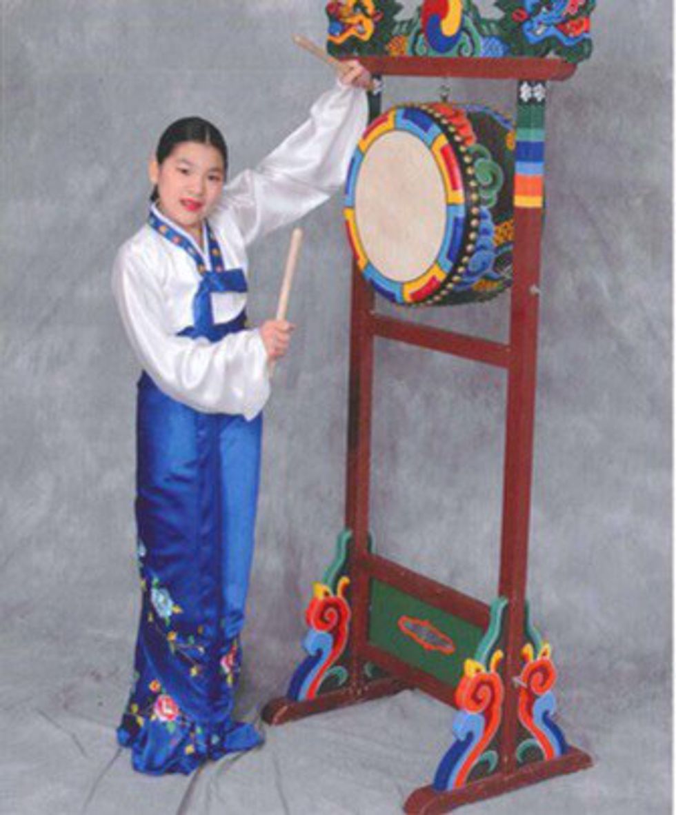 [Pictured above: Me with a samgomu drum. Normally there are three. I will say, this hanbok does a better job in showing off my figure.]