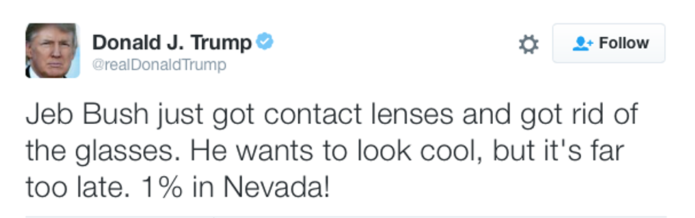 Again, this calls me to ask does Donald Trump think this is a run for the presidency of the U.S., or presidency of his 8th grade class? Just scroll through his twitter, you'll find a bunch more.
