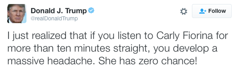 What are you, twelve? Some other examples of Donald Trump being the school bully is when he tweeted this about Carly Fiorina: