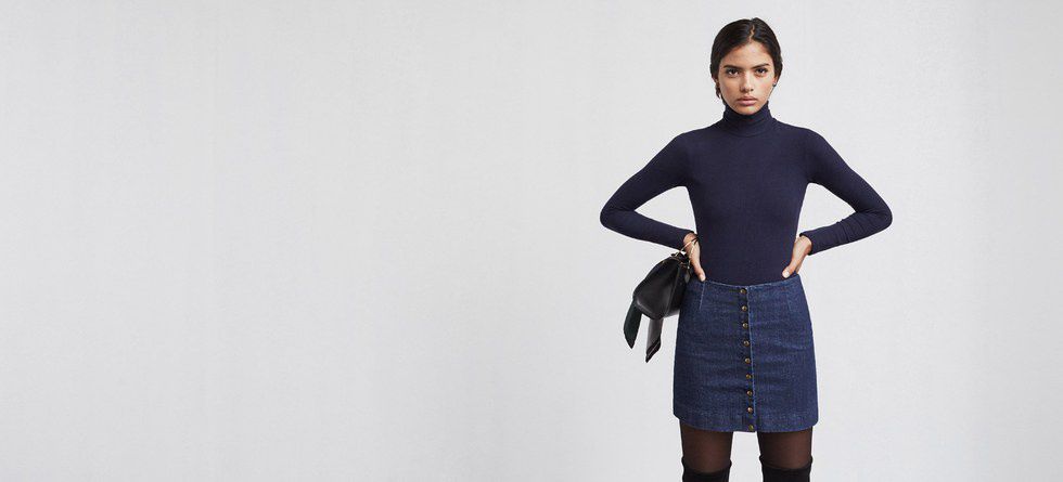 I know you want the front button down skirt that everyone has. Reformation took it to the next level. Pair it with a turtle neck like this model and you found your new fall go-to.