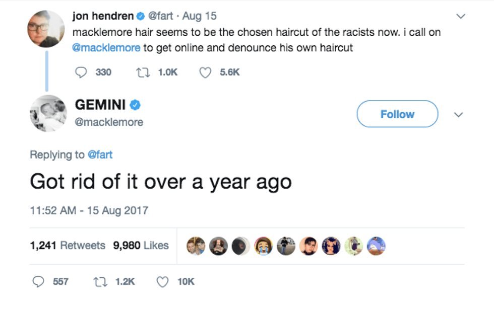 Macklemore does not need to "denounce" his haircut because there was nothing to denounce in the first place. It's a haircut people, not a middle finger to a race.