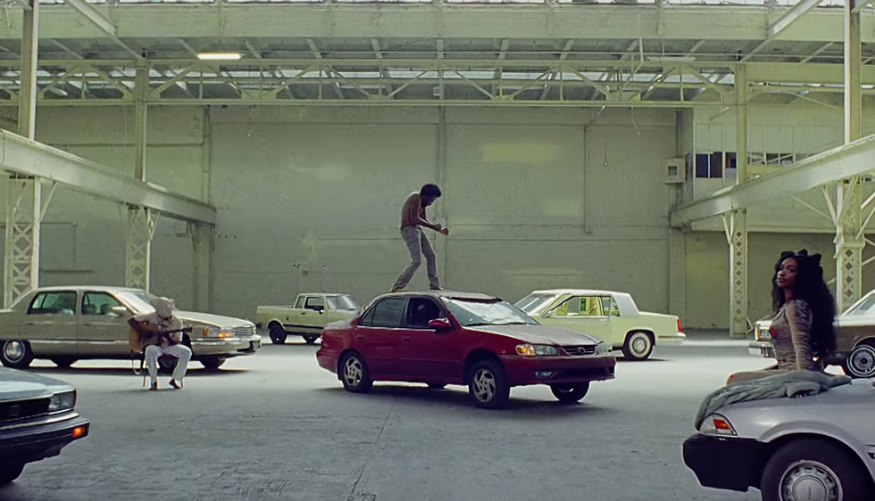 SZA, one of many featured on this track. The scene begins with a voice that sounds eerily like James Brown and is followed by his iconic dance style. The cars used are all older models from the '90s and '80s. They contrast the style many rappers use where they only show the newest luxury models.