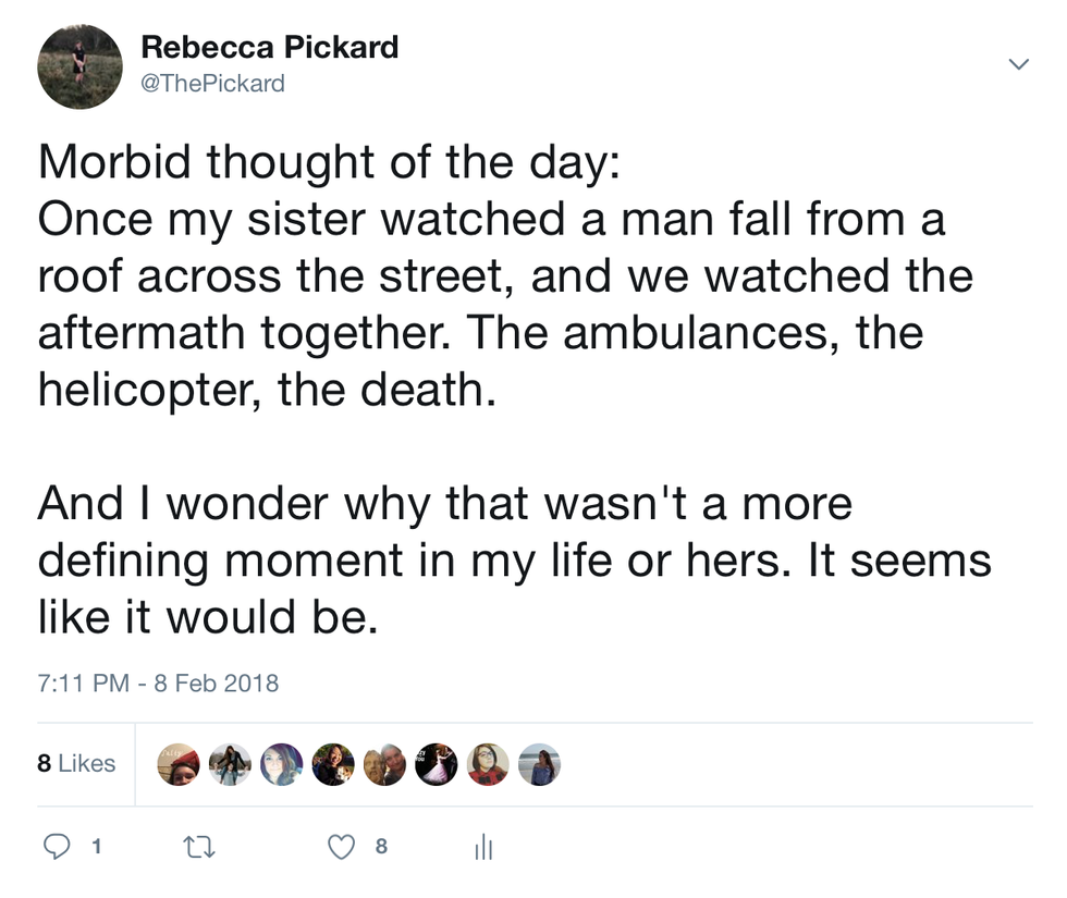 And I couldn’t help but remember holding my sister’s hand, saying nothing. I don’t know what I was thinking in that moment. But now I wonder what it was like for my sister to watch him fall, to act as the messenger of death to the adults. I wonder what it was like for her to watch her parents, her aunt and uncle, all her older cousins... I wonder what it was like to see the adults in her life motionless, unable to help a dying man.
