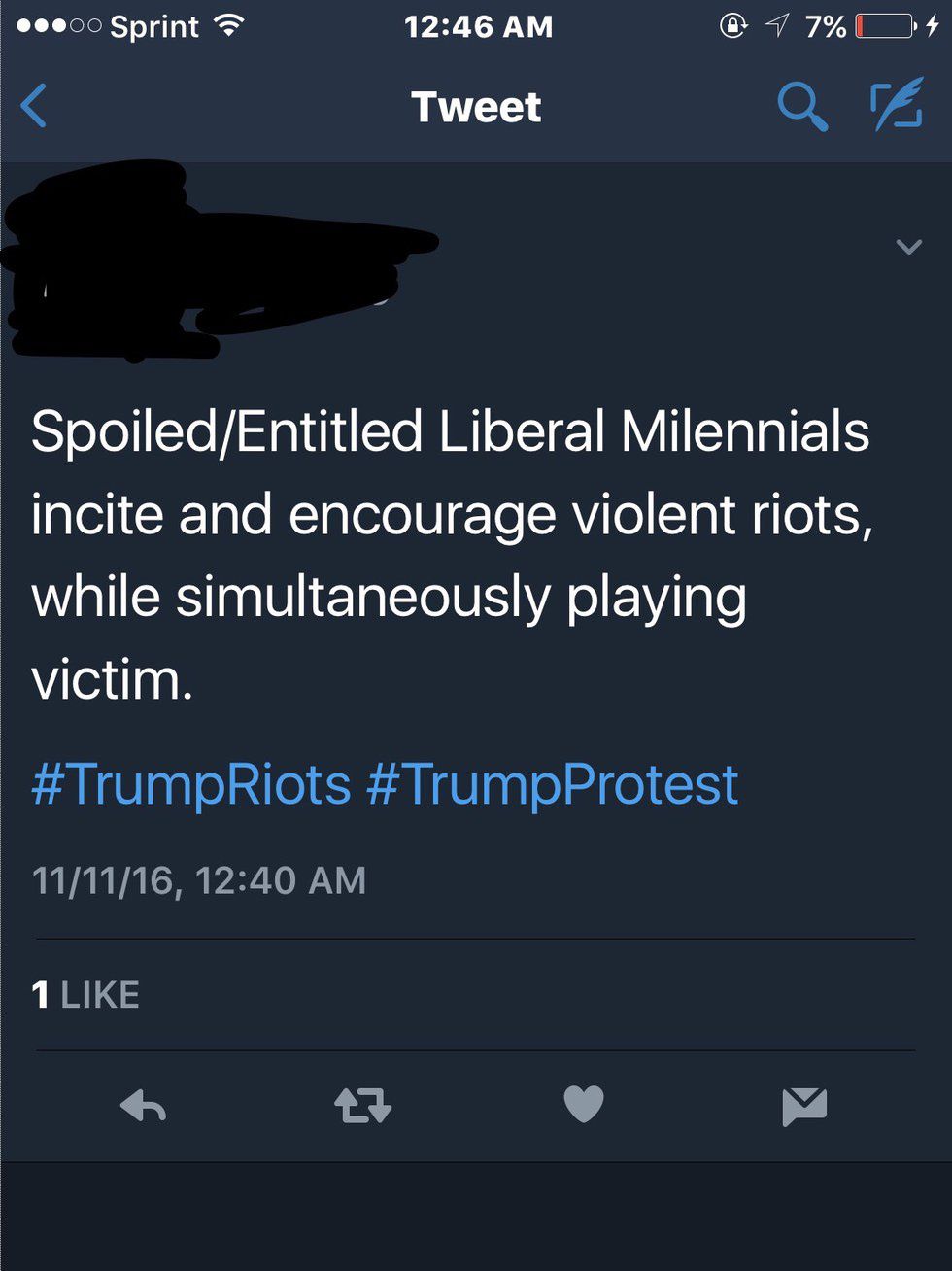 REALLY?! This is just one example as to why millennials are pissed. The popular vote was won by Hillary Clinton by a wide margin and yet we get a president elect whose rhetoric encourages this type of violence. Granted, I am a strong Hillary Clinton supporter and was crushed when she lost, but I would've gladly voted for anyone other than Donald Trump. Another thing I've been hearing lately is that millennials are being "cry babies". If not wanting our new president to be someone has been accused of sexually assaulting women and even got caught making disgusting remarks about how his celebrity status lets him do whatever he wants to women is being a cry baby then give me a damn sippy cup. Our generation at least from my point of view is feeling something very personal right now and its anger. I could go on and on about what Donald Trump has said and done but that would take too long. Instead here is another one of his supporters and their opinion on the protests.