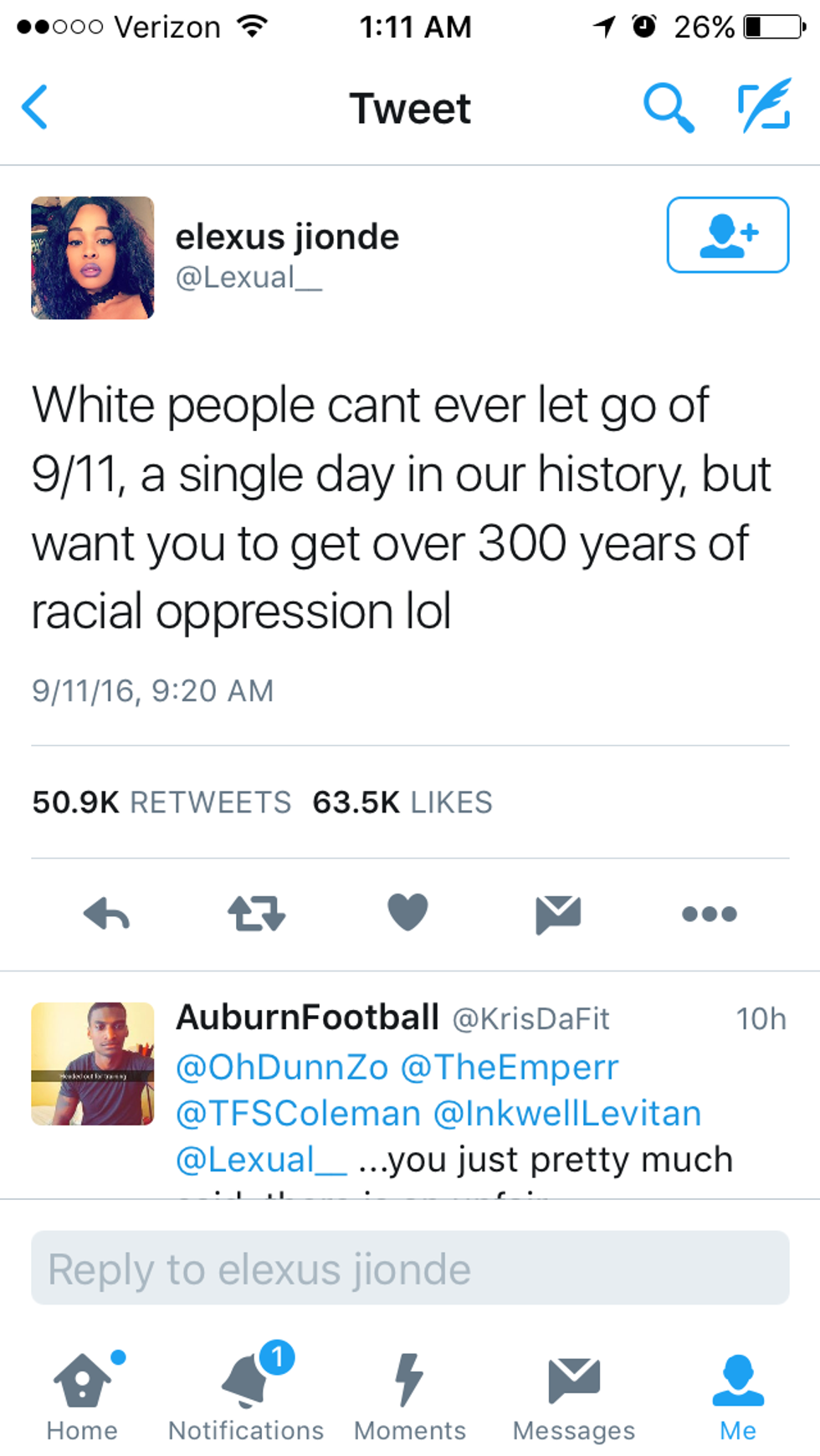 The next point that I want to bring up is that this tweet perfectly embodies some of the idiots of 2016 to me. It does so because it feels like every issue that has ever been brought up this year, someone has to bring race into it. I am not saying that racism isn't a big issue that we need to discuss, but I am saying that it should not be forced into something where it doesn't belong. I think that it is people like this who give America a bad name. Because to me, this woman is not smart, using racism to redirect September 11 into something that isn't. It was not an event based on race, it was an event based on religion and terrorism. So stop making it into something else.